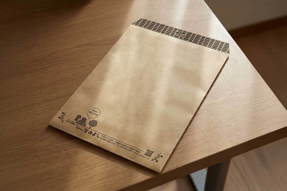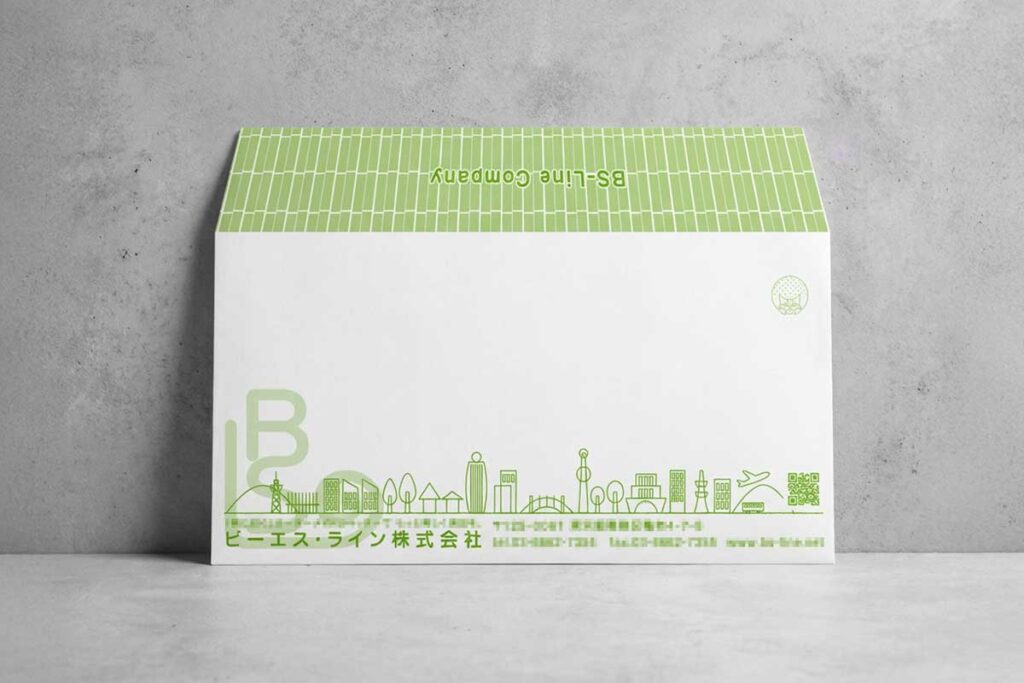 長3サイズ(120mm×235mm)の封筒デザイン。ビジネスシーンで最も使われる定番サイズで、請求書や案内状、DMの送付に最適です。A4用紙を三つ折りにして入れられるため、企業の事務用途からダイレクトメールまで幅広く活用できます。