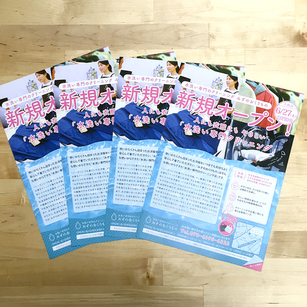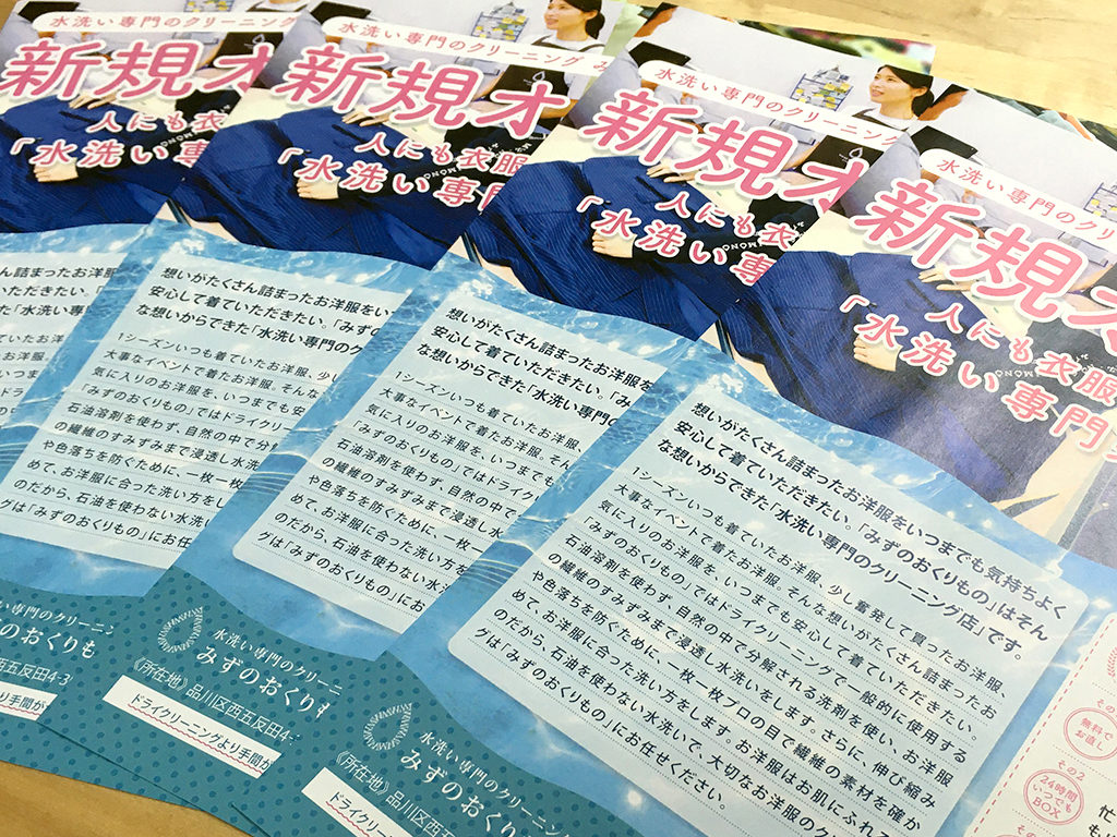 東京都大田区のクリーニング店M様から、新装開店のチラシをご依頼いただきました。新規オープンのチラシで一番大切なのは、「新しくお店ができたんだ!」って一目で分かっていただくこと。だから、上の方に大きく目立つように「新規オープン」の文字を配置しました。