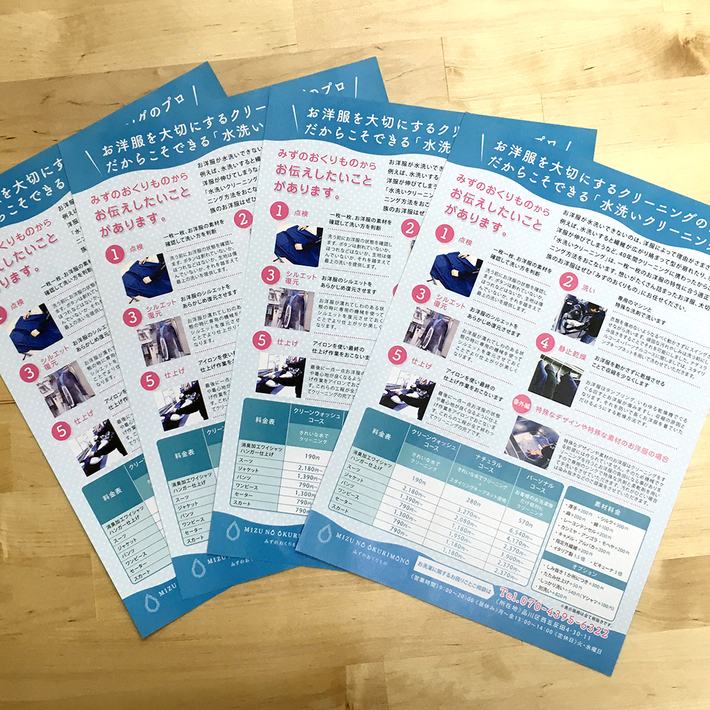 背景には、クリーニング店だと分かる写真を入れています。文字を読んでいる時も、視界の中に写真が入るので、クリーニング店のチラシだって自然に認識してもらえるんです。パッと見た瞬間に大事な情報が伝わるよう、レイアウトを工夫しました。