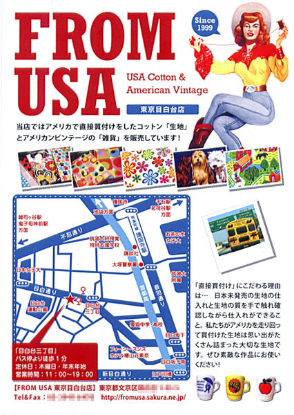 紙面上部には、カウガールをモチーフにしたクラシックなイラストと、力強い「FROM USA」のタイポグラフィを配置しました。赤をベースカラーに使用し、アメリカの雑貨店のような明るく賑やかな雰囲気を演出しています。また、実際に取り扱っている色鮮やかな生地の写真をポラロイド風に並べることで、商品の多様性を楽しく伝えています。