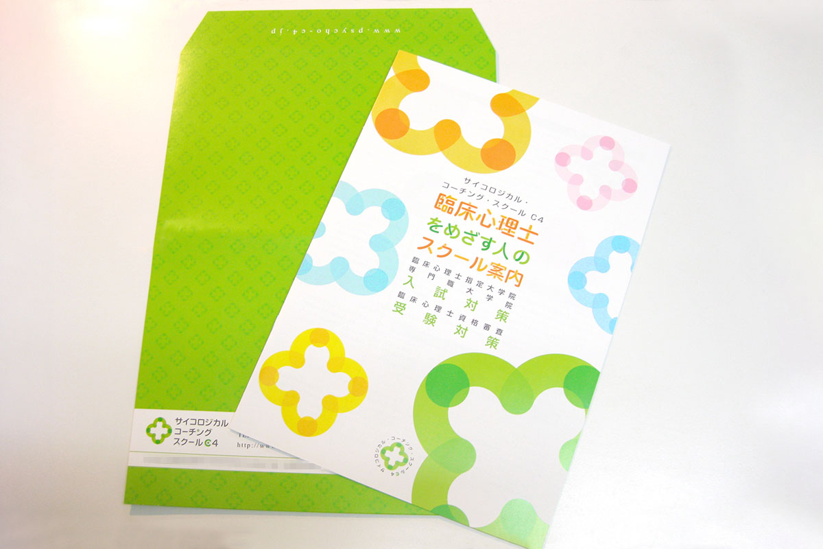 多くの資料が届く中、真っ白な既製品の封筒では他の案内の中に埋もれてしまいます。臨床心理士という専門的な分野でありながら、学び始める方の不安を和らげるような「温かな雰囲気」と、スクールの存在を強く印象づける「視覚的インパクト」の両立が大きな課題でした。中野区で長年親しまれているC様らしさを、いかに色と形で表現するかが焦点となりました。