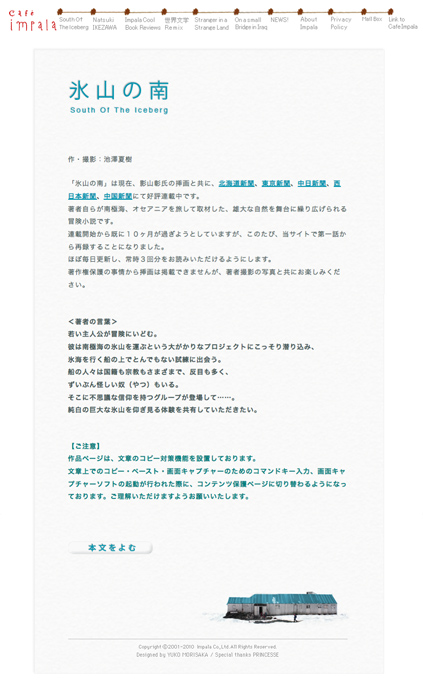 TOPページは、余白を活かしたシンプルで品格のあるレイアウトを採用しました。 インパラのアイコンをシンボルとしつつ、最新のお知らせやコンテンツを整然と配置することで、作家の現在の活動がダイレクトに伝わる設計にしています。