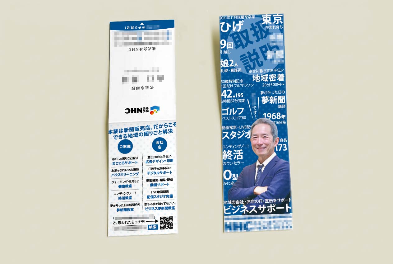 開く楽しさをプラスした二つ折り名刺。縦型・横型から選べ、通常サイズでは伝えきれない魅力を、見やすくスマートに展開できます。
