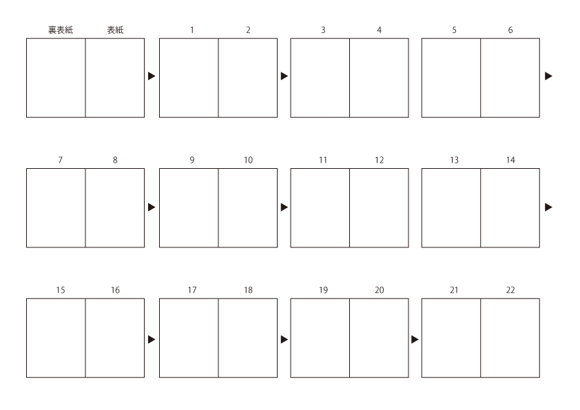 台割り表を作るコツは、頭の中だけで考えず、実際に手を動かして図にしてみることです。まずは大まかな流れを考えるために、下の図のような「2ページが見開きで並んでいる展開図」を用意してみてください。