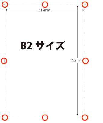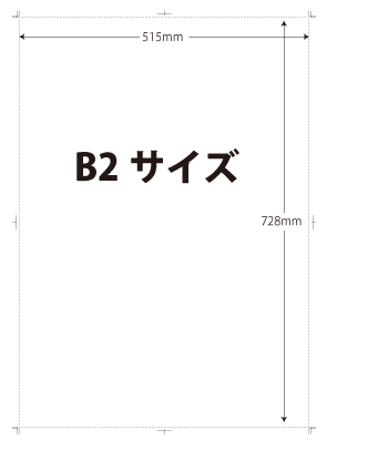 まずは、B2サイズの等倍(実際のサイズ)のデータを作成します。このとき、「トンボ(トリムマーク)」を必ずつけてください。トンボとは、印刷の際に正確な裁断位置を示す目印のことです。これがあると、後からきれいに切り揃えることができます。