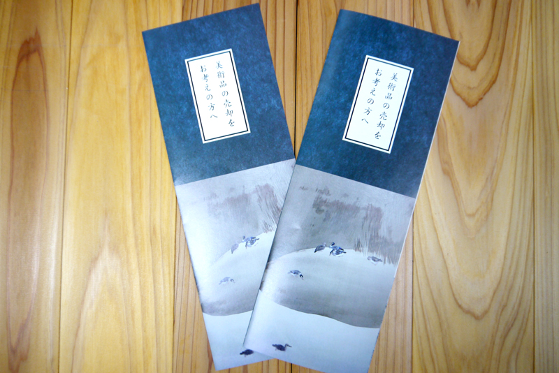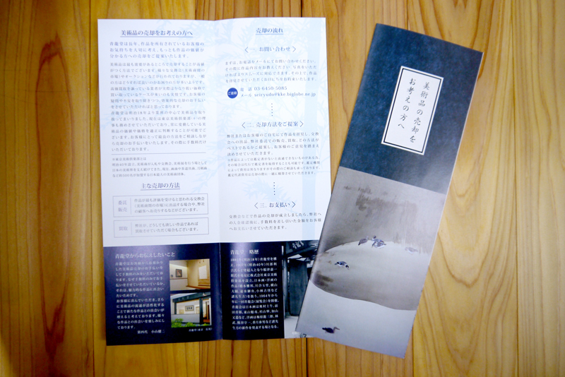 美術品への深い造詣を感じさせる落ち着いたトーンを採用しつつ、査定や売買の流れを分かりやすく整理。動画でも解説している通り、めくるたびに信頼が深まる三つ折りの特性を最大限に活かしました。